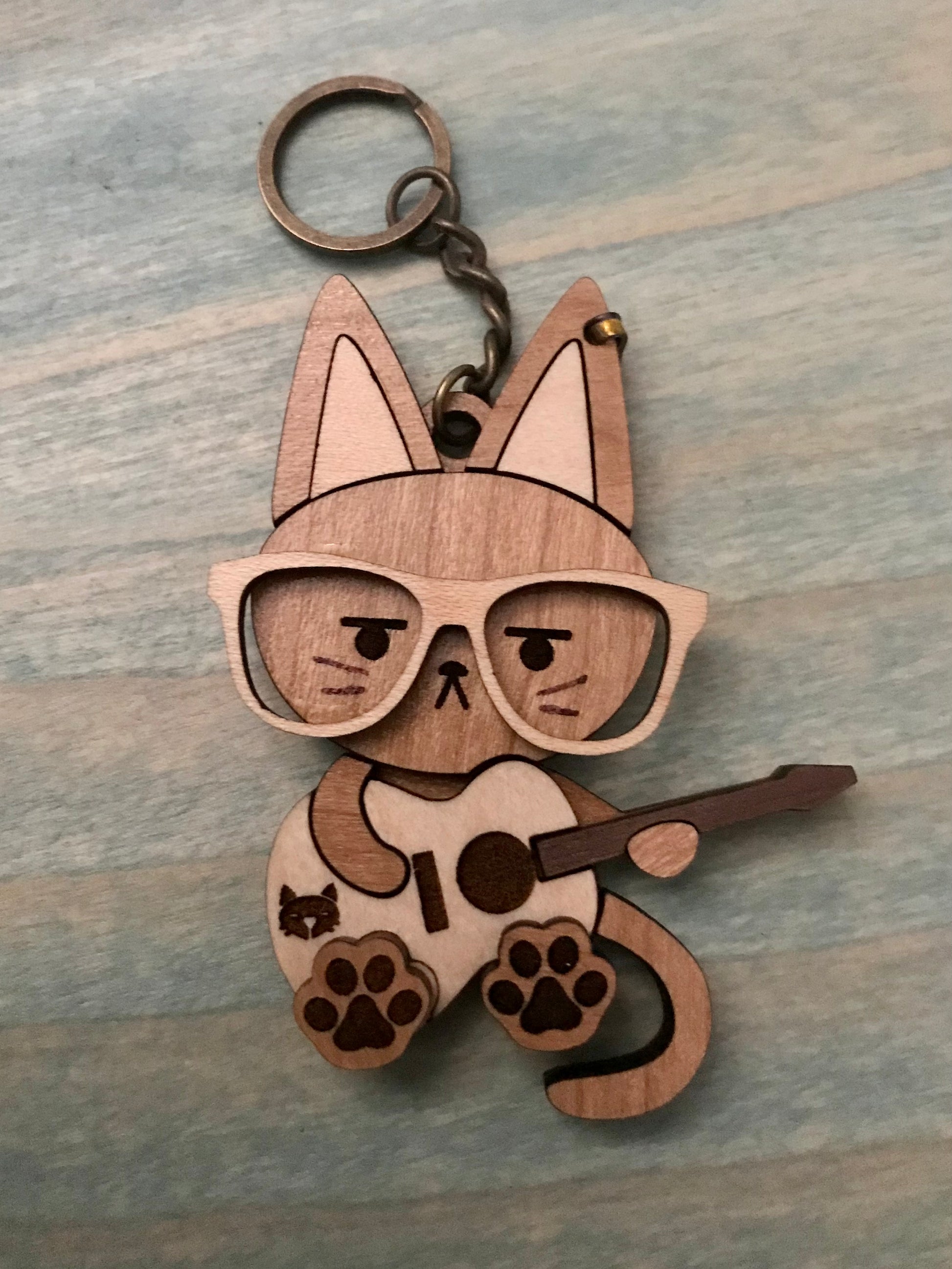 Cool cat key chain made of maple, cherry and walnut wood plays his guitar engraved with a cat and has cool ear ring.