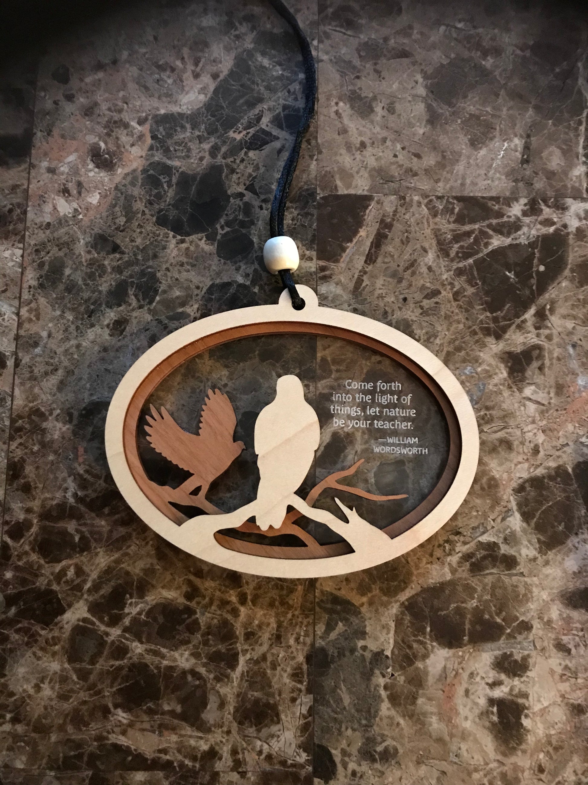 Three layered wildlife ornament for all seasons. First hawk layer is maple wood on a second hawk layer of cherry wood. The third background layer is clear acrylic with a wildlife quote. Choice of four famous quotes.