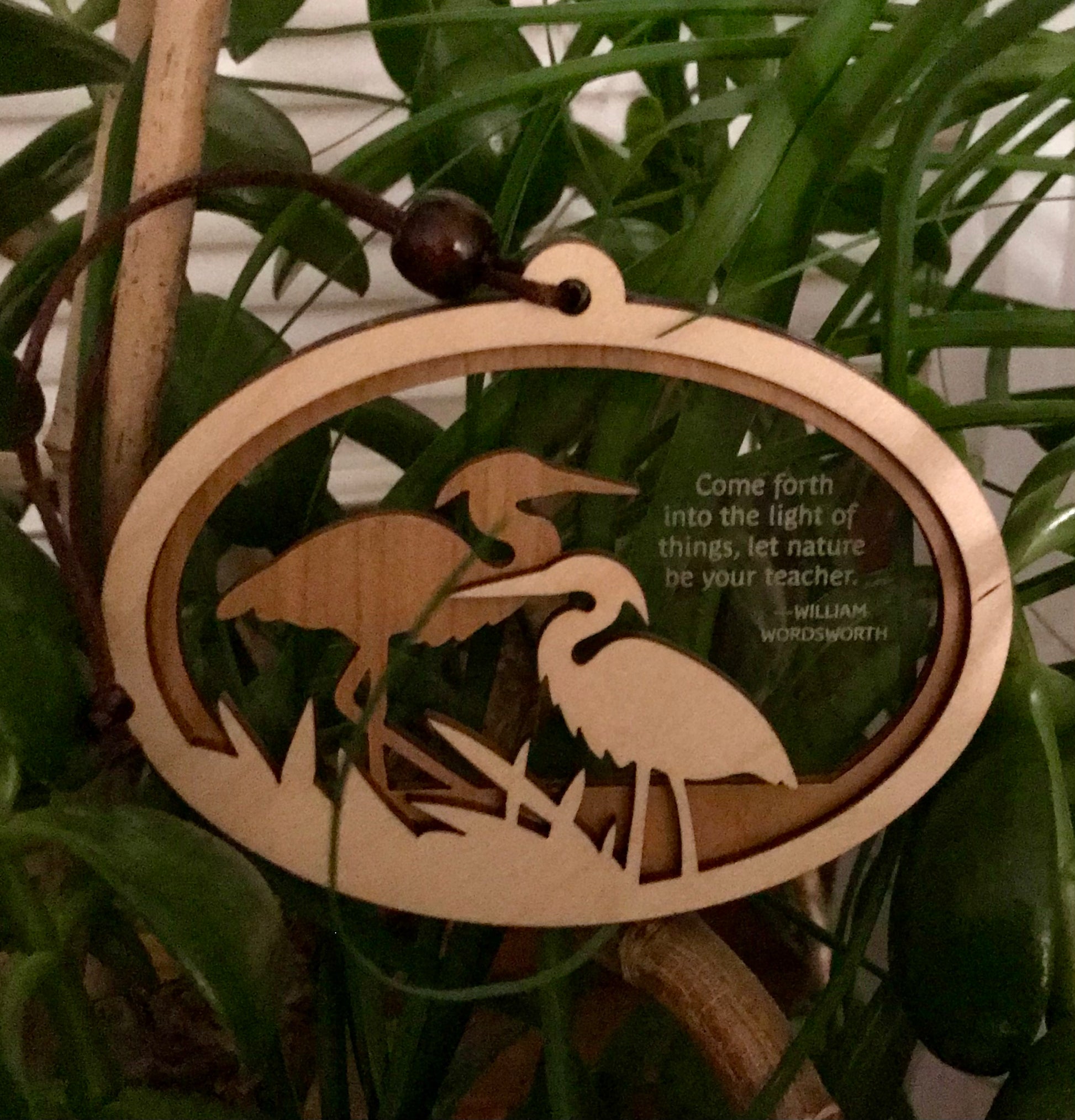 Three layered wildlife ornament for all seasons. First heron layer is maple wood on a second heron layer of cherry wood. The third background layer is clear acrylic with a wildlife quote. Choice of four famous quotes.