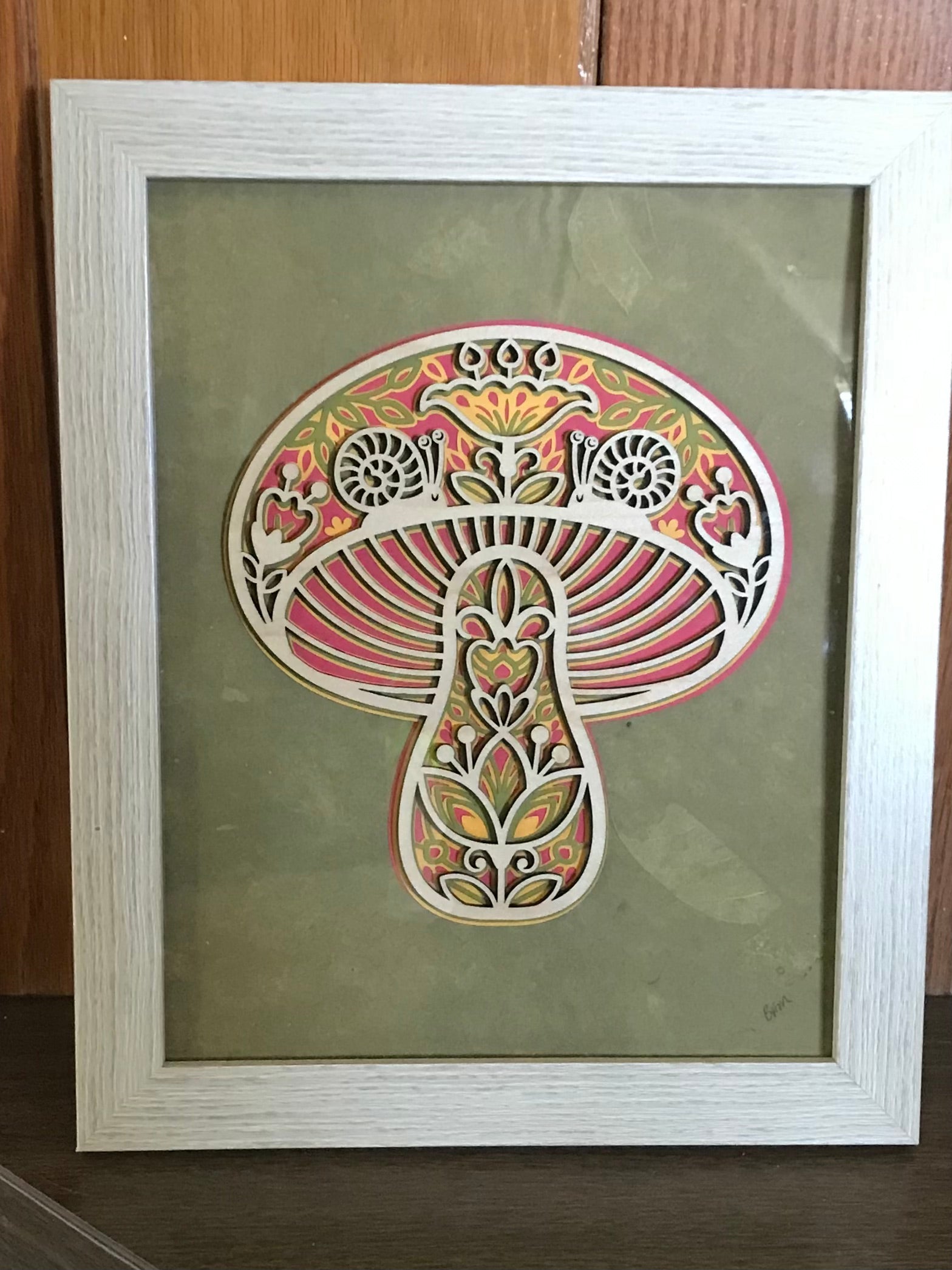 Intricately laser cut wooden mushroom in finished maple. Layered in a mandala fashion with colored heavy weight paper and mounted on a background of handmade mulberry paper. Framed in an 8” x 10” wall frame.